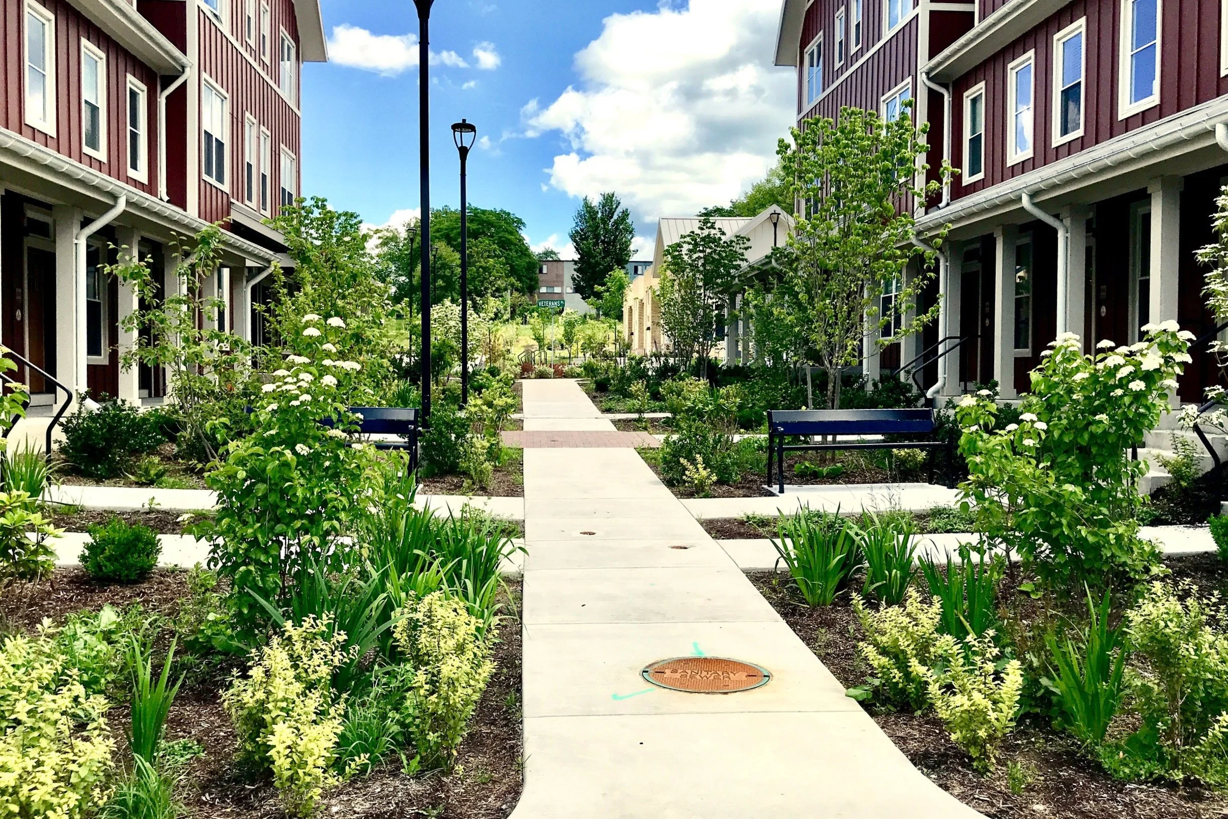 The multi-phased Maplewood campus-planning project transformed what was once a military housing village with about 180 cottages in disrepair into a revitalized university housing complex with over 400 units. Working with Cornell’s graduate committees, Greystar property management, Torti Gallas + Partners Architecture, and others, WPD successfully led the project’s community outreach, municipal approvals, and landscape design. In response to our team’s outreach, the development became a transitional neighborhood between the university and the village, with higher-density apartment buildings to the north and lower-density cottages to the south. Our municipal approvals process for this project included Site Plan Review, State Environmental Quality Review, an Environmental Impact Statement, and Planned Development Zoning. WPD’s site design focused on improving connectivity, walkability, safety, and pedestrian friendliness, with newly integrated trails, a bioswale, a community garden, a hammock grove, and open lawns.